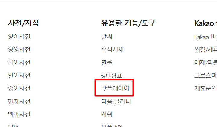 메뉴를 이용하는 방법의 순서, "다음 메인 > 더보기 > 서비스 전체보기 > 유용한 기능/도구 > 팟플레이어" 순으로 찾아가시면 도움이 될 것입니다.