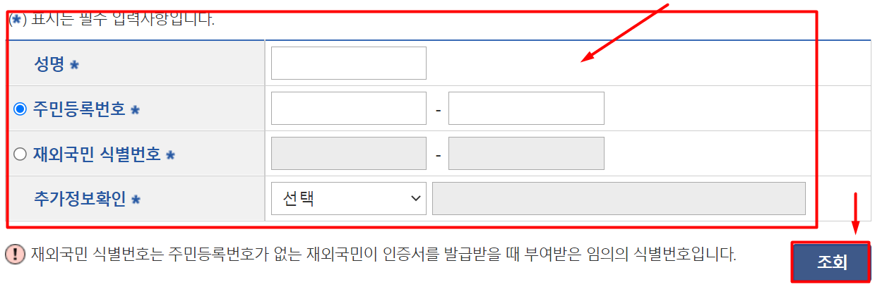 3. 신청인 정보 조회를 위한 성명, 주민등록번호, 재외국민 식별번호, 추가 정보 확인 등의 정보를 입력하셔야 합니다. 필수 입력사항이기 때문에 꼭 정확하게 입력해주세요.