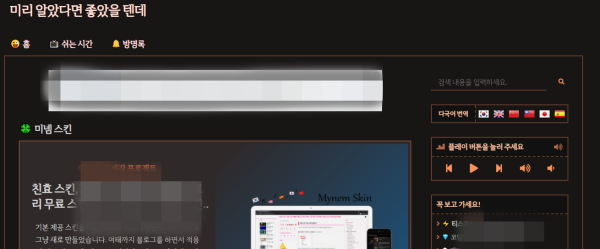 최근 많은 사람들에게 인기를 얻고 있는 무료 스킨이라고 하네요. 기본적인 번역기능, 음악 플레이어 기능, 다크 모드 등을 지원하고 있다는 점도 큰 장점인 것 같습니다. '미넴 스킨'으로 검색하시거나, 티스토리 홈페이지 스킨 페이지에서 찾을 수 있습니다.